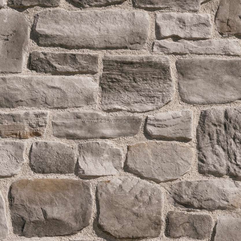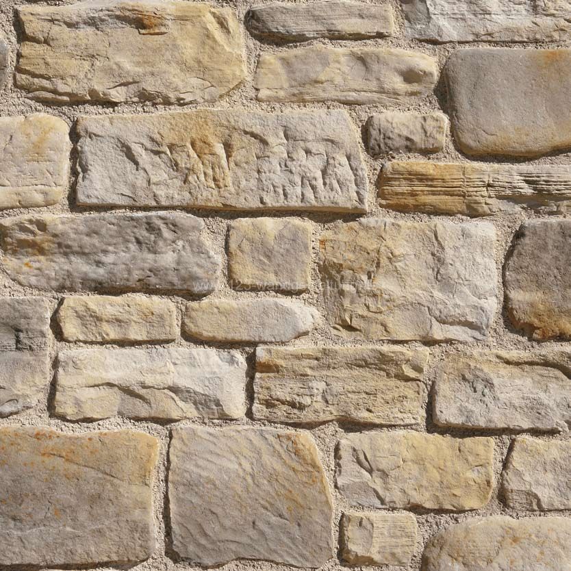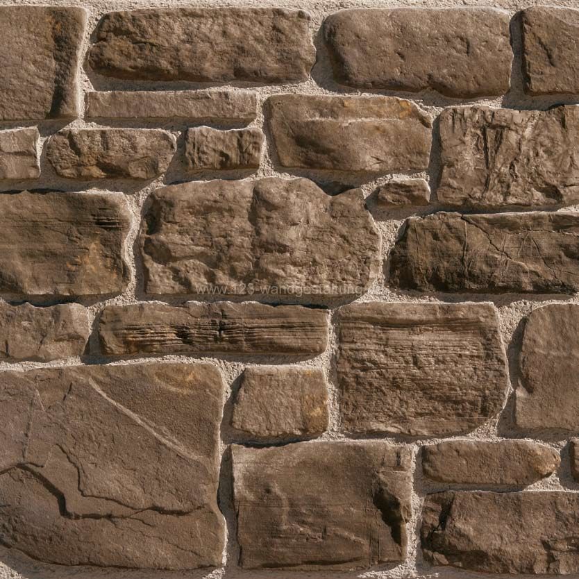 Kunststein Wandverkleidung mit unregelmäßigen Formen und strukturierter Oberfläche. Dieser Kunststeinriemchen in Natursteinoptik wurde sorgfältig nachgeahmt bis ins Detail, mit Rissen und kleinen Einschlüssen, die an Feldsandstein erinnern.